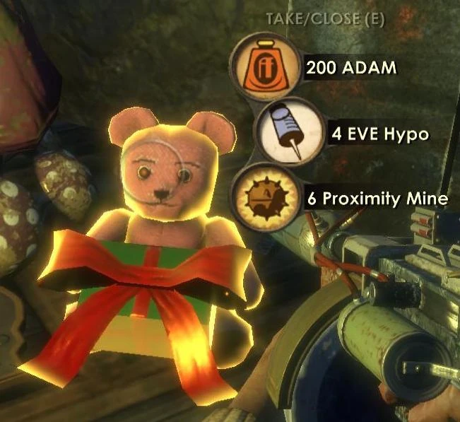 NOTE : Une fois un cadeau "ouvert", il disparaitra une fois hors de votre champs visuel. Toutefois, si vous apercevez quelque chose que vous aimez mais ne pouvez pas récupérer - comme par exemple si vous avez déjà 6 mines de proximité et que vous voulez les utiliser contre un Protecteur - n'ouvrez pas le cadeau. Utilisez vos mines, puis fouillez le cadeau ensuite. Vous pouvez également utiliser la liste ci-dessus pour planifier vos choix et, par exemple, ne pas vous inquiétez d'arriver à court de seringues d'Eve ou de trousses de soins.