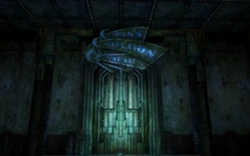 persistenti sopra uno sfondo opaco raffigurante forse la città di Rapture. Il dipinto poggia su un cavalletto robusto con comode sedie su entrambi i lati. Di fronte alla reception c'è un quadro di quella che sembra essere una sorta di stazione completa con panchine, lampioni, e un orologio appeso al soffitto. Direttamente di fronte, a sinistra dell'ingresso, c'è una piccola scrivania. Sopra alla scrivania vi sono un thermos di Caffè e una scatola di sigari Oxford Club. Gli unici dipinti rimanenti che si trovano sulle pareti sono entrambi storti. Una porta conduce alla galleria. Quattro grandi finestre