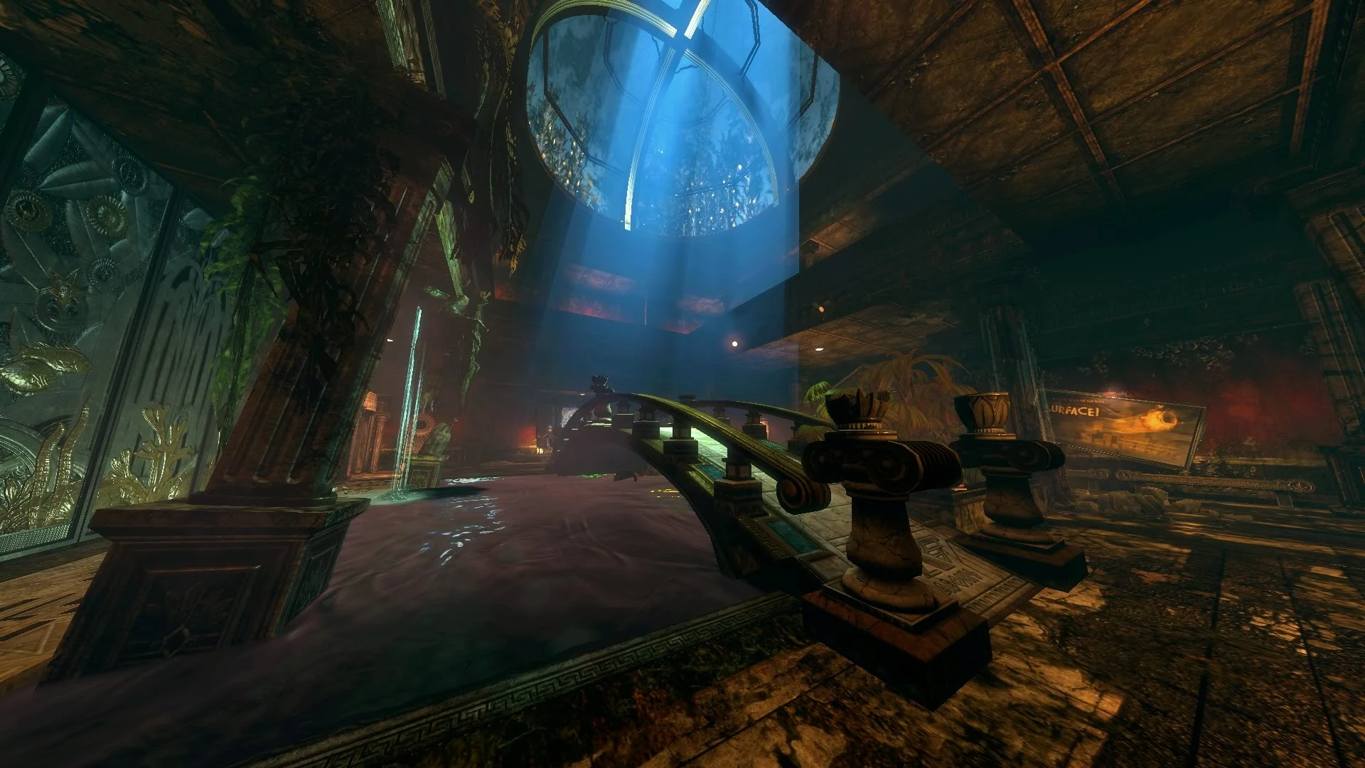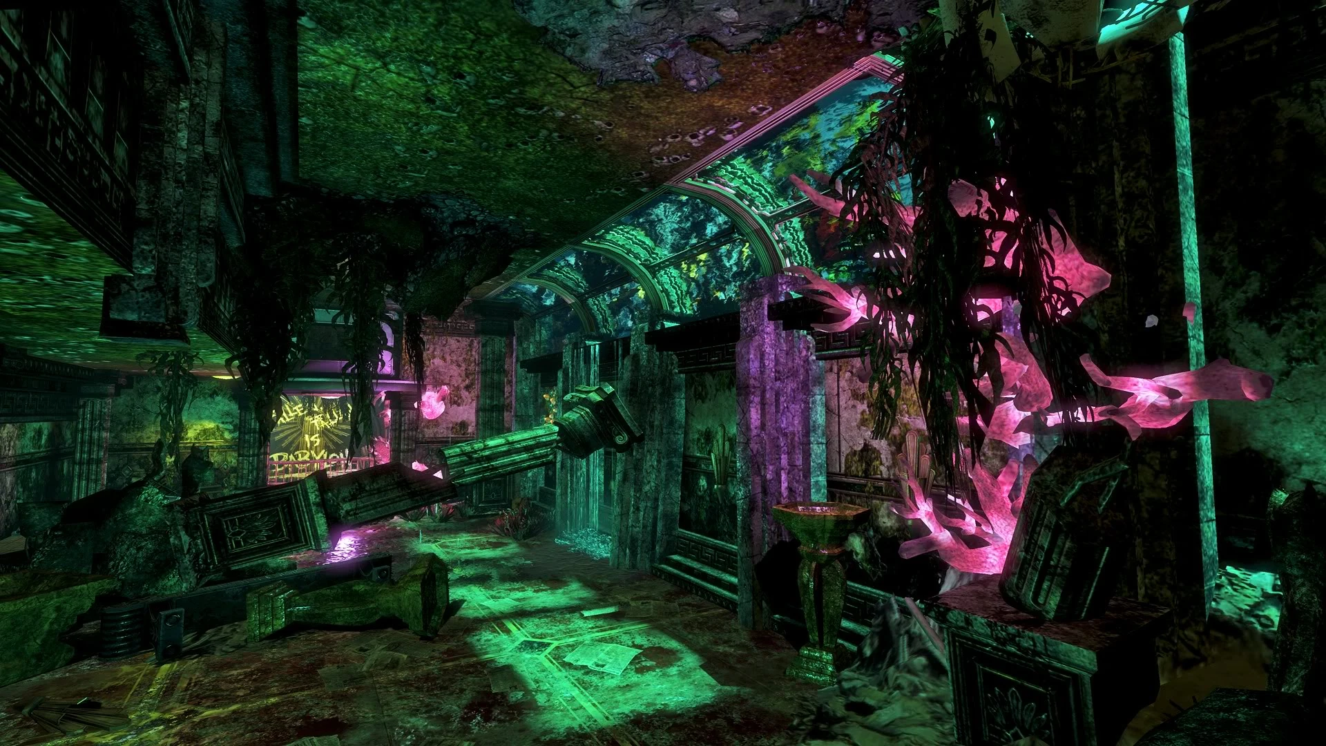 Most of this grand room is now damp, dark, and warped out of shape by the influx of sea water, which caused a large abundance of glowing sea plants and coral to grow. At some point the mural of Rapture which stands at the head of the staircase was used as a memorial to all those lost.
