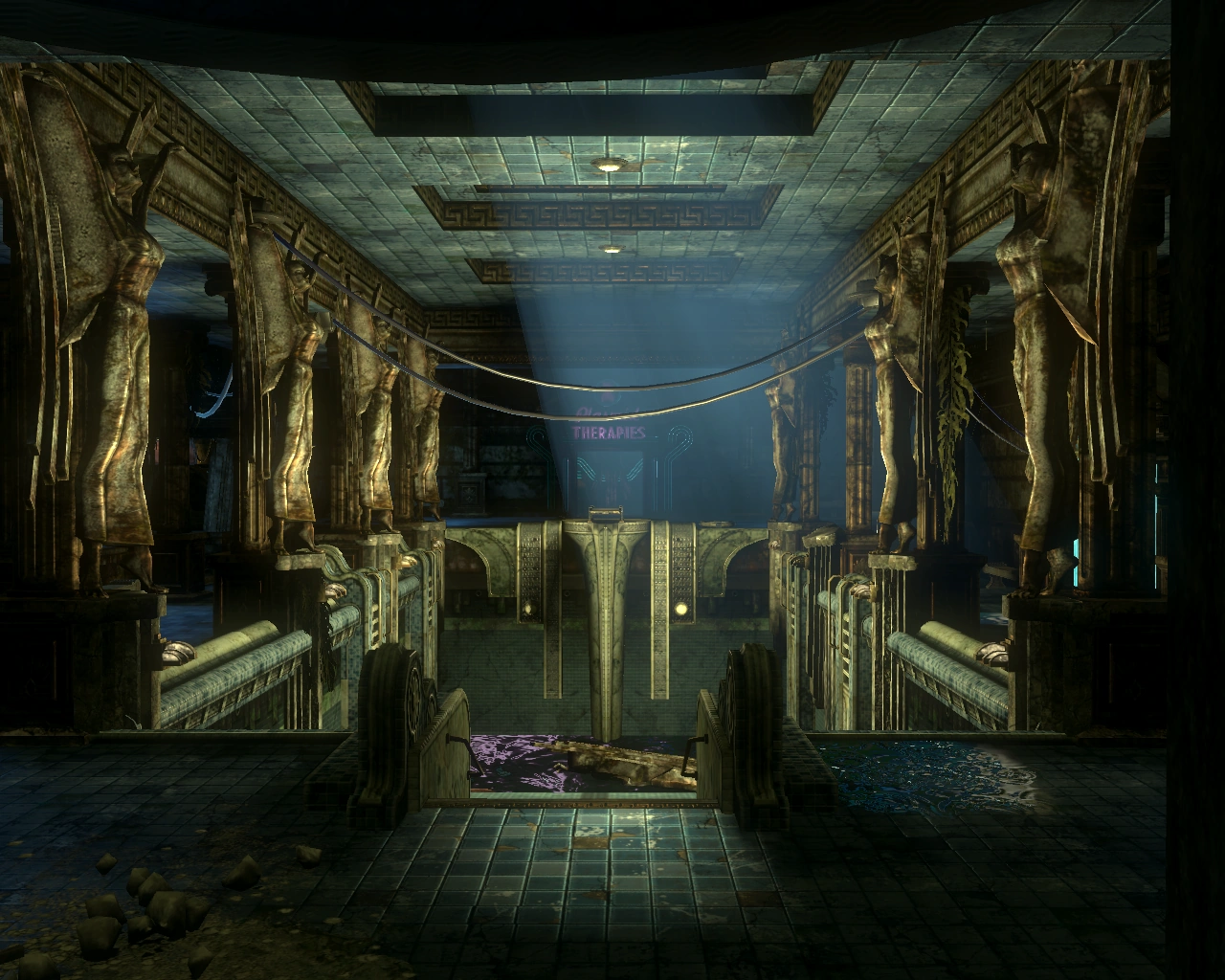Named after Demeter, the Greek goddess of agriculture, this area was once a lavish two-story dining area with an impressive window view of the ocean. The area lies in ruins, with entrances and stairways down to the main floor blocked by rubble. The Banquet Hall becomes submerged after a Big Sister slices the window open in an attempt to get rid of Subject Delta.