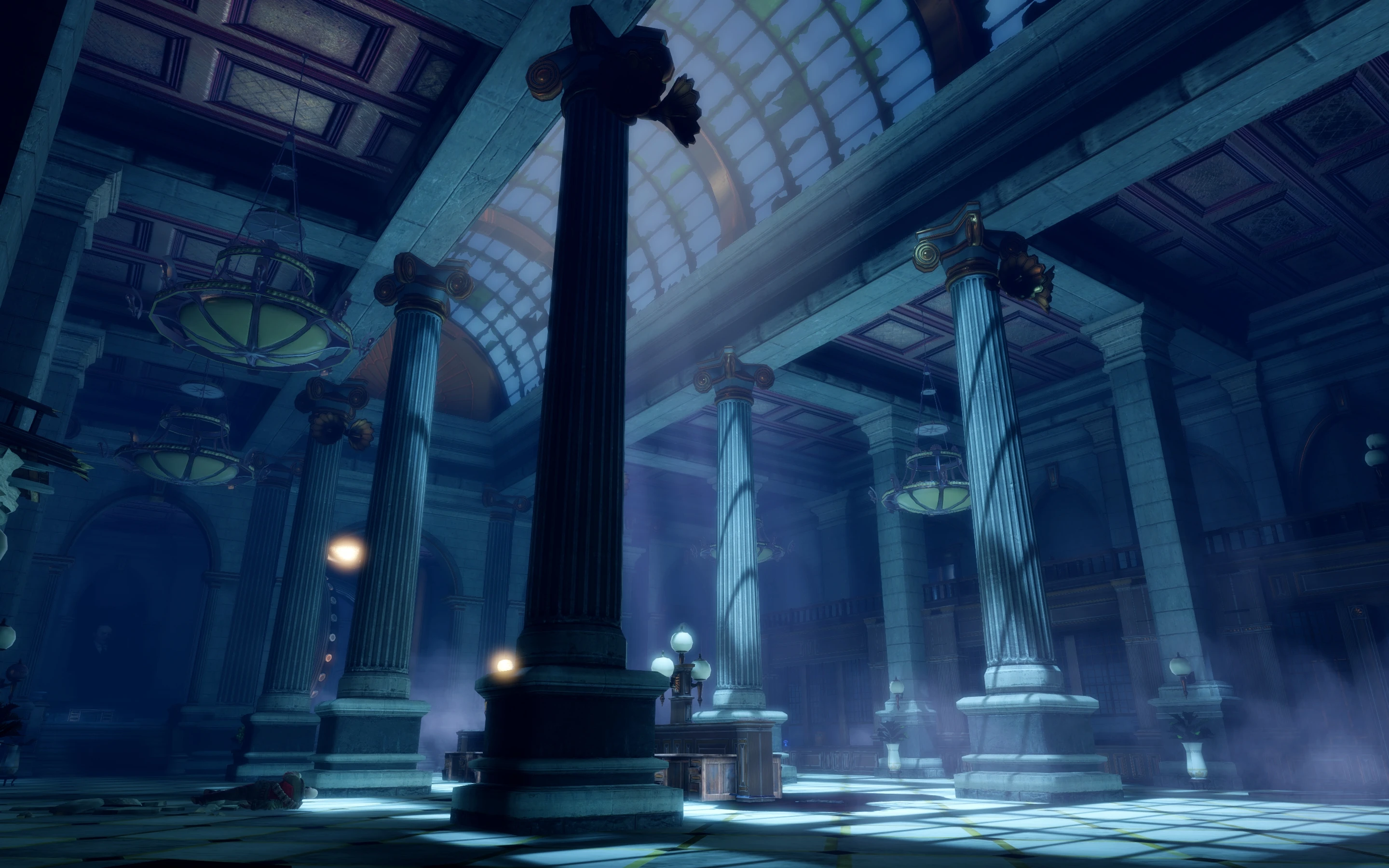The player can optionally enter the Foyer of the Bank of the Prophet after the battle at the Financial District when Booker and Elizabeth arrive via the help of a hairpin to unlock the main entrance. Besides the three Kinetoscopes, and Silver Eagles around the reception, and the unaccusable elevator, there is not much interest the Foyer, which has been left untouched by the devastation outside, not counting the dead rose bushes aliening pillars in the dimly lit area.