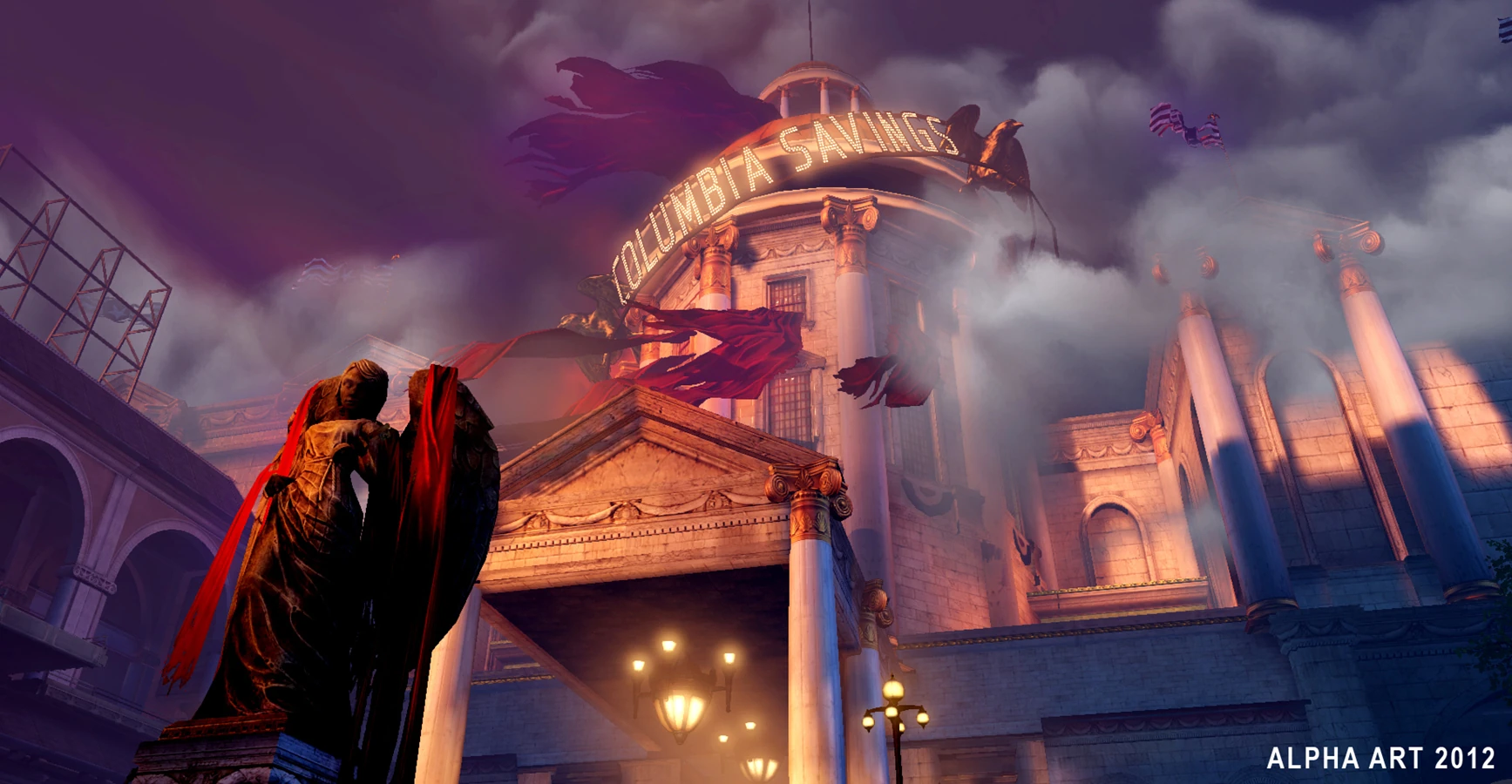 By the time of BioShock Infinite, when Booker DeWitt and Elizabeth reach the bank, much of the inside is dark and dreary. While the Foyer is open to peruse, Booker and Elizabeth will not be able to access the elevator until they have attempted to enter the Comstock House Gate in Victory Square and explored the Memorial Gardens, where they have been tasked to "learn three truths", mainly involving Lady Comstock.