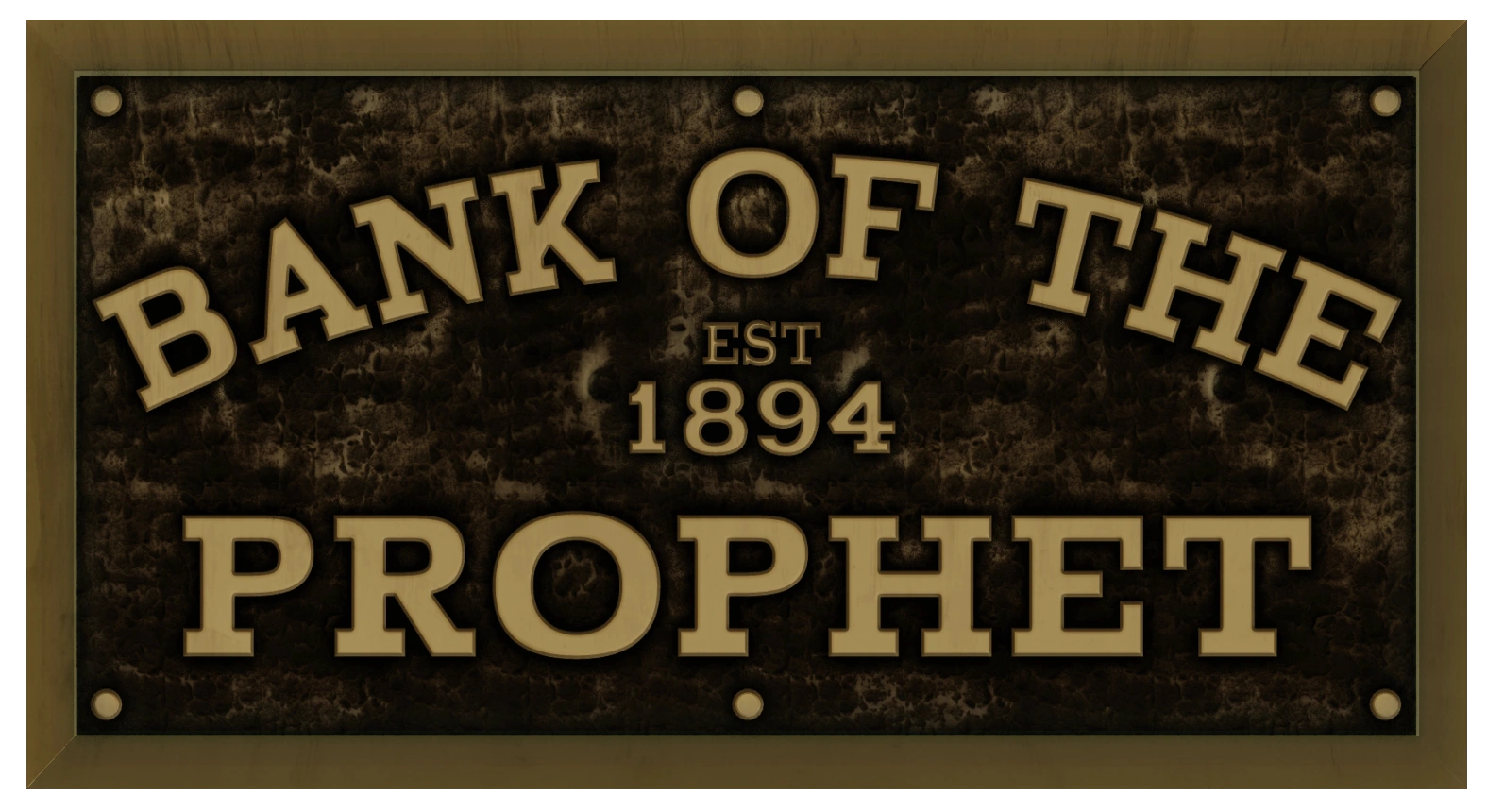 • The Bank of the Prophet sign was repurposed from the Columbia Post Office sign, which was cut from the game. The sign uses the exact same background base and the "est 1894" text.