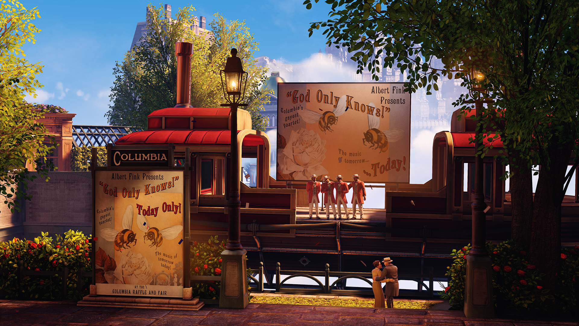 After entering Columbia, Booker DeWitt travels through the Town Center in order to find and retrieve a girl on Monument Island. While walking on New Eden Square, a hovering gondola carrying the singing group arrives. A couple is dancing near by to the music, and if the player likes, Booker can stay and listen as well. After the song is finished, the quartet continues their tour.