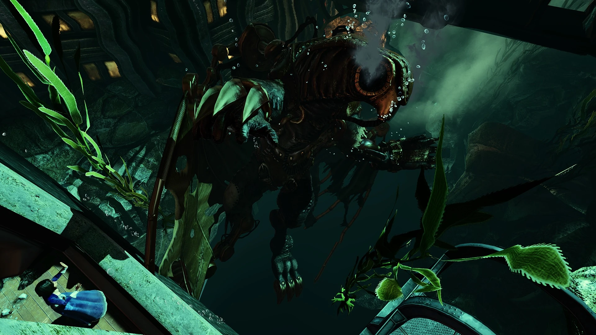 The station is very dark, with much of the lighting having failed some time previous. Abandoned suitcases and protest signs lie scattered around the place, a sad reminder of those who desperately wanted to leave the dying city. It appears the protests that took place at the station turned violent, as the connecting bridge to the second Bathysphere dock is destroyed, and a pillar has collapsed near the exit, which is now blocked by rubble. Somewhere in the rafters, Rose can be heard humming If I Didn't Care by The Ink Spots. After some Security Bots scare her off, Jack acquires the wrench.