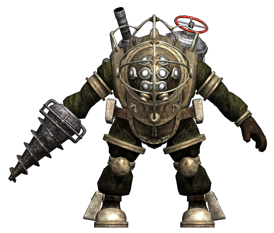 Like Subject Delta, other failed prototypes of the Alpha Series of Big Daddies survived. They have long since lost their Sisters, and have devolved into something vaguely like a Splicer. These are barely sentient monsters that attack anything near them. Like Delta, they can use Plasmids and regularly emit bursts of Electro Bolt, Incinerate!, and Winter Blast from their malfunctioning suits. They tend to use Launchers, Machine Guns, and Shotguns in addition to their Plasmids. Their armor is similar to Delta's, but more decayed, with parts of their arms exposed.