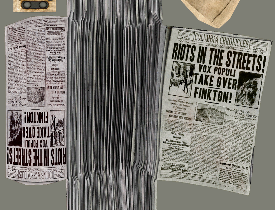 A third newspaper issue of Columbia Chronicles was made, but the model is not seen anywhere in-game. The headline reads: "RIOTS IN THE STREETS! VOX POPULI TAKE OVER FINKTON!"