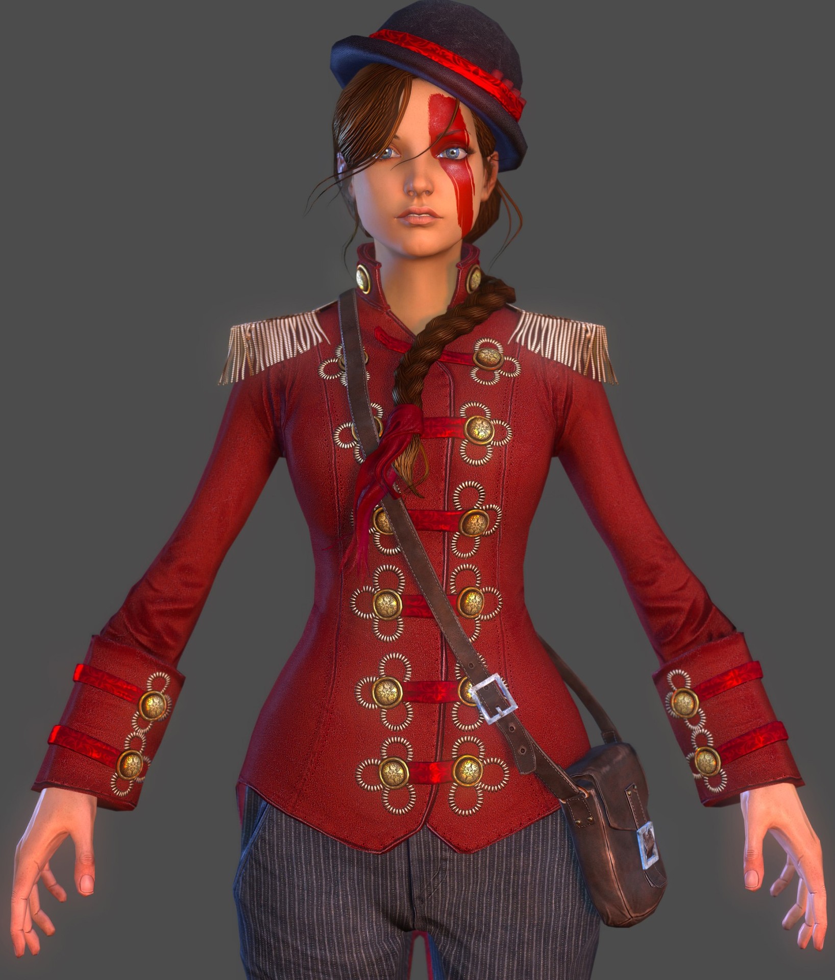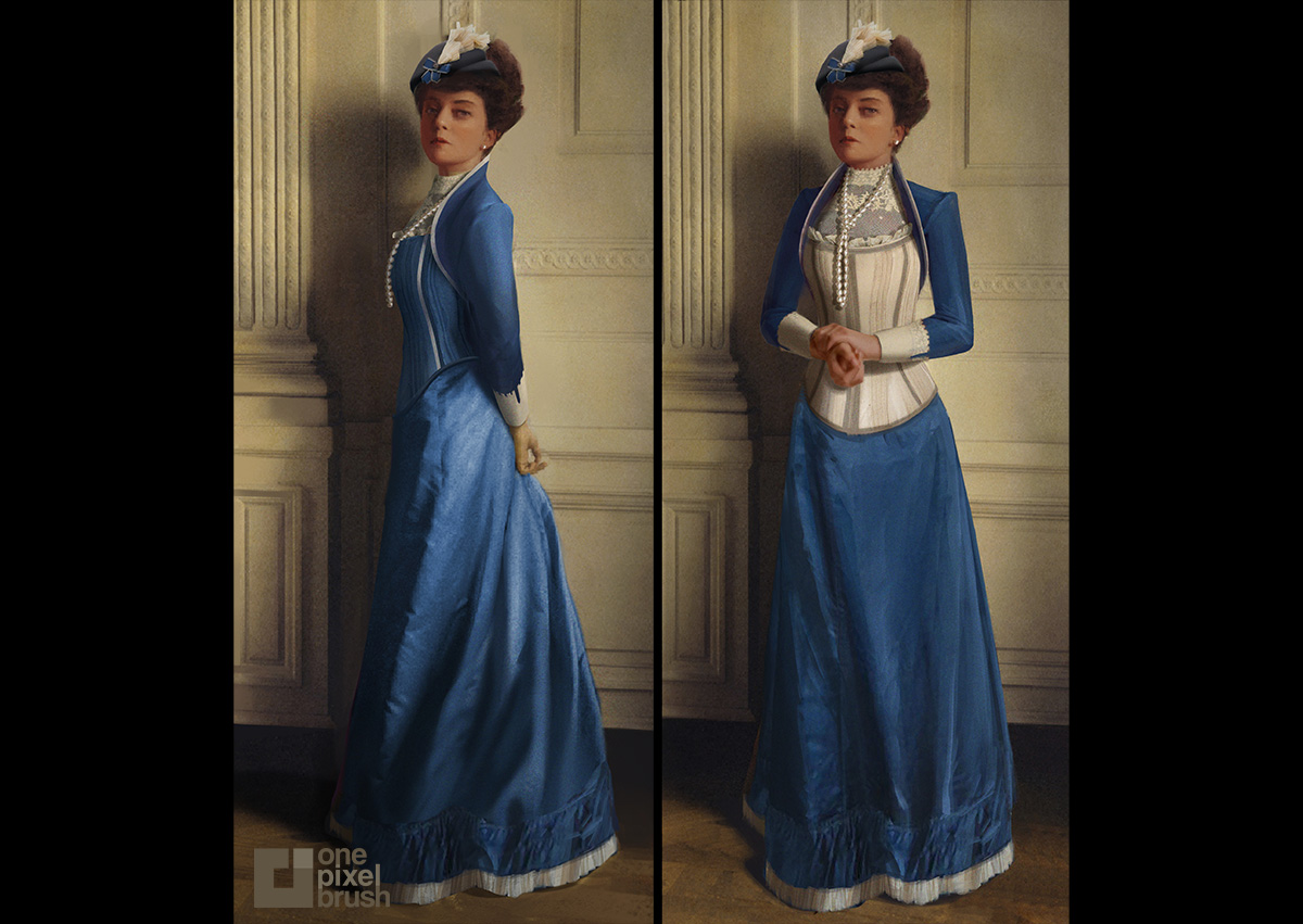 Two Lady Comstock portraits were made for the game, both based on a portrait of Alice Roosevelt Longworth, but only one made the cut (the one on the left in the image to the right). Notably, the unused model features a white corset instead of the blue one seen on the used portrait. The white corset was used on the in-game model of her dress, which can be later seen on Elizabeth.