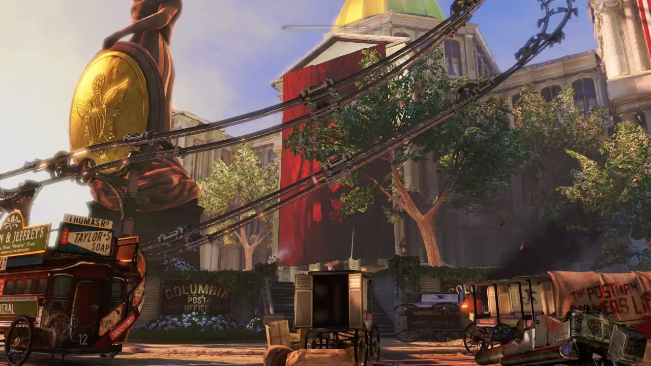 It was mentioned in the BioShock comparison interview that this was meant as an art contrast from BioShock's Rapture, since Rapture was focused with Art Deco.[3] However, it was found that while Art Deco architecture had simple shapes with low polygon counts, making it easy to generate in the game's engine, the Art Nouveau style was too complex, with very fine-tuned round designs which used more polygons -- more than they could afford in their rendering budget. This caused them to revise it for the current Beaux-like appearance. Still, some Art Nouveau assets do appear in the game, such as furniture, and decorative frames and signs in Emporia, Comstock House and the Church of Comstock.