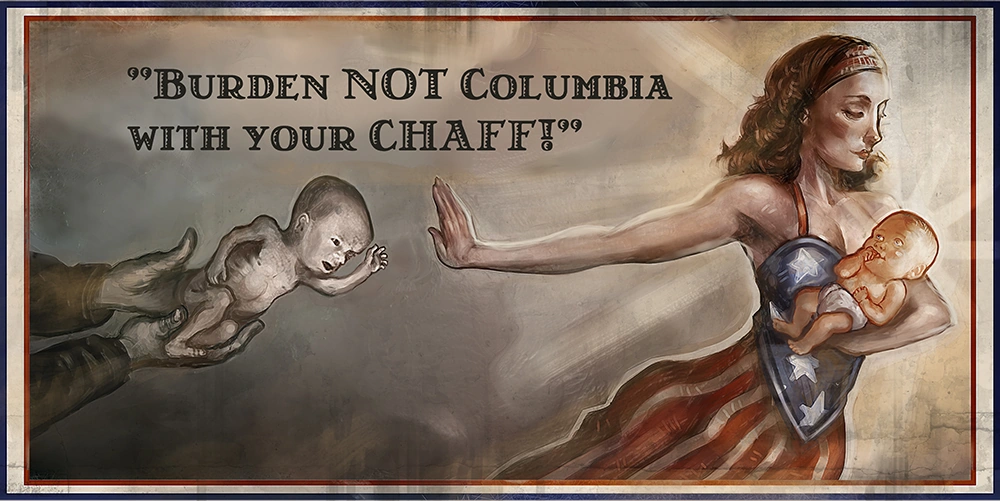 An early version of the "Patriots! Protect Columbia!" poster was seen in the 2010 Gamescon BioShock Infinite 10 Minute Gameplay Demo (at 3:13)[7] and it was based on the 1922 N. C. Wyeth painting, John Burns of Gettysburg. The "Daddy, what did you do during the Siege of Columbia?" was seen in the BioShock Infinite TV Commercial (at 0:15).[53] The "Columbia Calls You!" poster was seen in the BioShock Infinite Premiere Trailer (at 1:04 and 1:19),[17] and the 2010 Gamescon BioShock Infinite 10 Minute Gameplay Demo (at 4:31, 5:35 and 7:03)[7] and is based on a "Clear the way!! Buy Bonds – Fourth liberty loan" World War I propaganda poster, designed by Howard Christy Chandler.[54] The "Youth of Columbia" poster is not known to have been seen in any pre-release footage, but has been released by official sources[55] and is based on a "U.S.A Bonds – Third Liberty loan campaign – Boy Scouts of America" World War I propaganda poster, designed by J. C. Leyendecker.[56] The "Burden NOT Columbia With Your CHAFF!" poster was seen in the BioShock Infinite Premiere Trailer (at 1:22).[17] The "True patriot has nothing to fear from the Songbird" poster was made for the game by Jorge Lacera but not used. However, the Vox Populi member on the poster was reused for cutouts at the Bull Yard and Bull House Impound as shooting targets. The "Her eyes… so blue!" poster appears in the Bull House Impound in the finished game, but an alternate version of it was seen in early footage, like the BioShock Infinite Premiere Trailer (at 1:44)[17] 2010 Gamescon BioShock Infinite 10 Minute Gameplay Demo (at 3:54 and 5:35).[7]