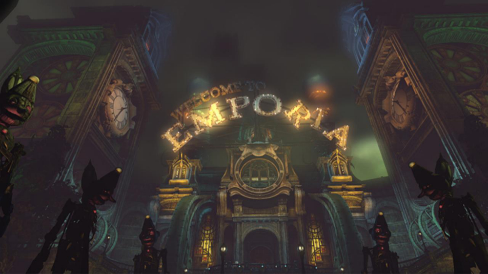 In the early "City in the Sky" or "Rapture in the Sky" prototype for Columbia, featured in both screenshots in The Art of BioShock Infinite and IGN's Early Elizabeth video, it was considered to have an Art Nouveau inspiration to its architecture, along with a more weathery and stormy atmosphere to create cloud cover. One of the current game's areas that appeared predominant throughout development was Emporia, only with automata-based statues, and buildings inside Rapture-like corridors with glass ceilings.