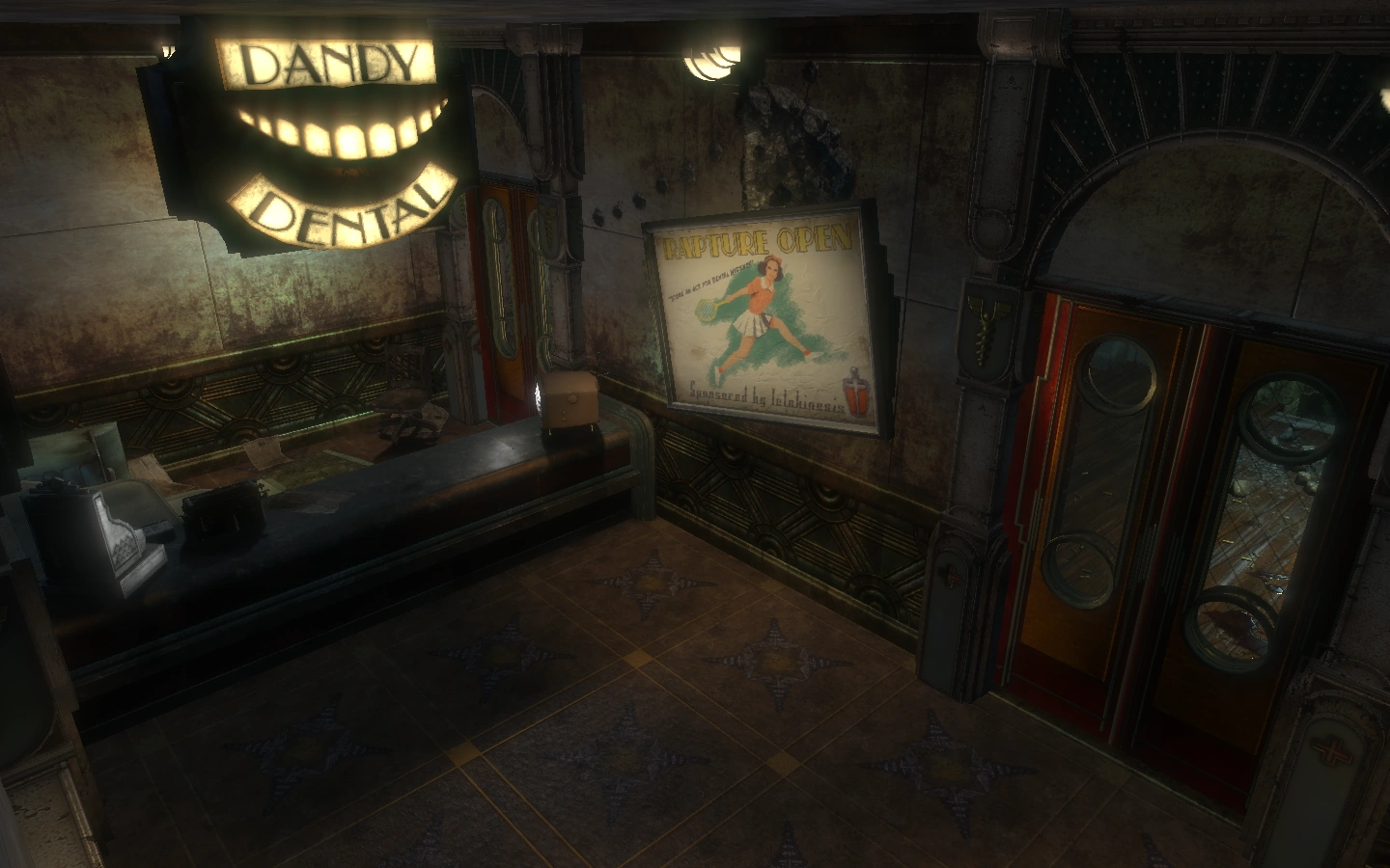 The small facility contains a reception area, an operating room, and a special room set aside for Rapture Open's "Score An Ace For Dental Hygiene!" event. It's door frame is adorned with Dandy Dental's logo, a toothy smile. At the reception desk, The Ink Spots' "The Best Things in Life" can be heard playing from the adjacent room. The operating room is a constant reminder of Rapture's steady decay. Water pouring from the ceiling has begun to flood the room. Plasmids surely made dental procedures faster than usual, as evidenced by the small number of dental chairs.