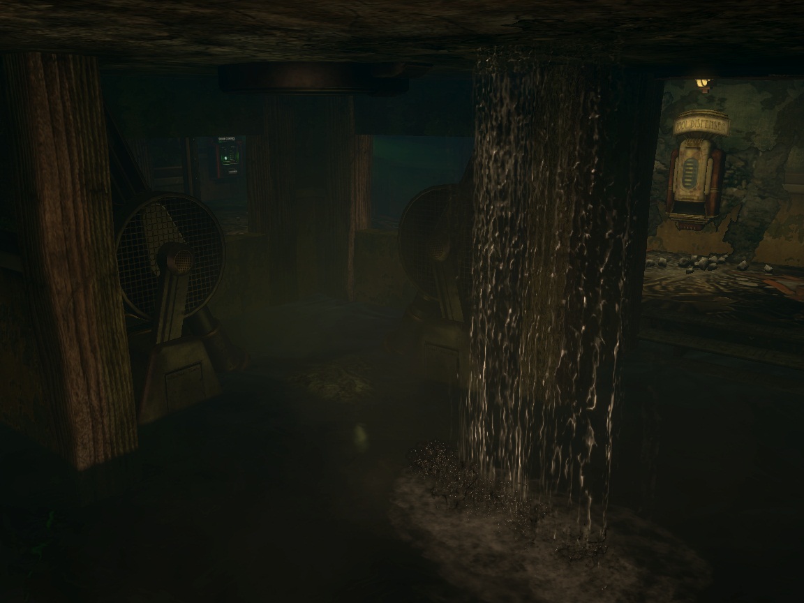 One floor beneath the Boardroom is the Maintenance Area. Here, staff would monitor and maintain the Executive Wing. Now the place is a dingy mess and the other rooms are inaccessible. A Hack Tool is located in the Machine Room along with a Tool Dispenser. After Sigma obtains the Hack Tool, he'll encounter two Splicers investigating the Boardroom. One Splicer controls a Security Bot which electrifies the pool of water by the clock inadvertently killing the other Splicer standing there.