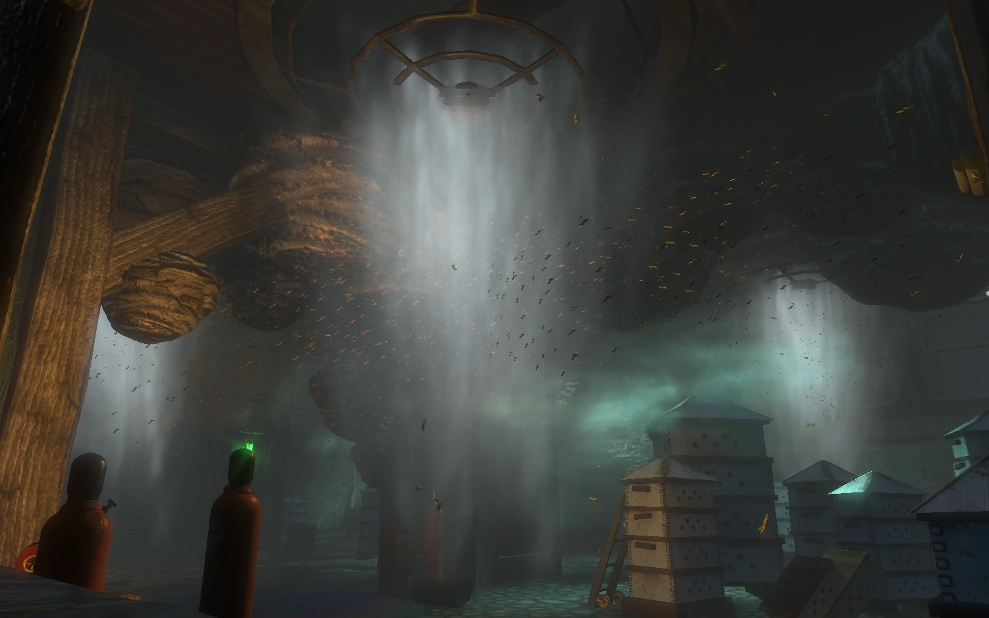 There are a total of four units, each found near a corner of the room. Pulling the lever on one of the two smoke controller consoles powers the fans to fill the area with smoke for a duration of forty seconds. In that time, Jack can search the facility for Enzyme Samples and other valuables. Green lights, positioned on the walls and door frames, flash to the click of a timer, sounding off the remaining seconds. By the time forty seconds are up, the smoke has cleared enough for the bees to return to their routine (and to be dangerous to anyone remaining in their proximity).