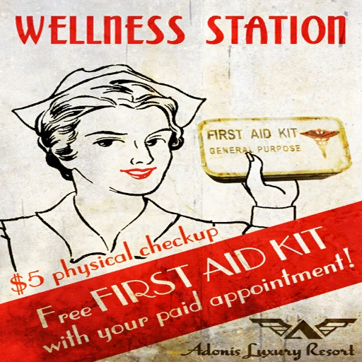 Vitastat's General Purpose First Aid Kits are single-use items that contain all the essentials to substantially heal the citizens of Rapture. They have an instant effect when used, and the granted amount of health is restored immediately. Upon usage, First Aid Kits will grant either partial or maximum health, depending on how much damage the player took. They are packed into durable, small tin boxes and can be bought from the Circus of Values, found laying on their own, in possession of Splicers, dead bodies, or by destroying a Health Station.