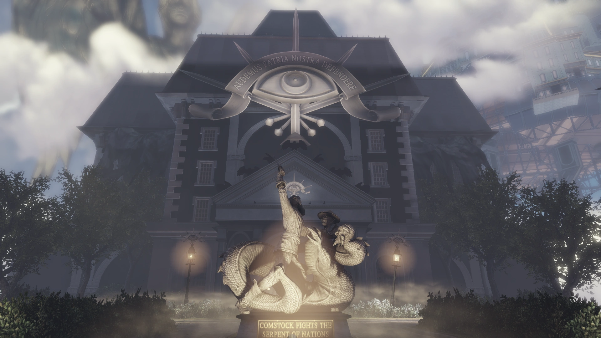 Booker discovers the Order's headquarters in Comstock Center on his journey to Monument Island. The courtyard has a statue of Comstock fighting the "Serpent of Nations", depicted as a hydra-like creature with gross caricatures of a Jewish, Black, and Asian man for its three heads. The building's interior is squalid, with debris littering the floor, lights dim and continually flickering, and raven guano scattered throughout. Platters of rotten food are ubiquitous, especially in the dining hall, and attract many flies and ravens. There is also a statue of John Wilkes Booth in the foyer, a lounge, and bar which contains a painting of Booth, in golden glow, assassinating a Devil-horned Lincoln at Ford's Theater, a reading room, and a large ceremony hall.