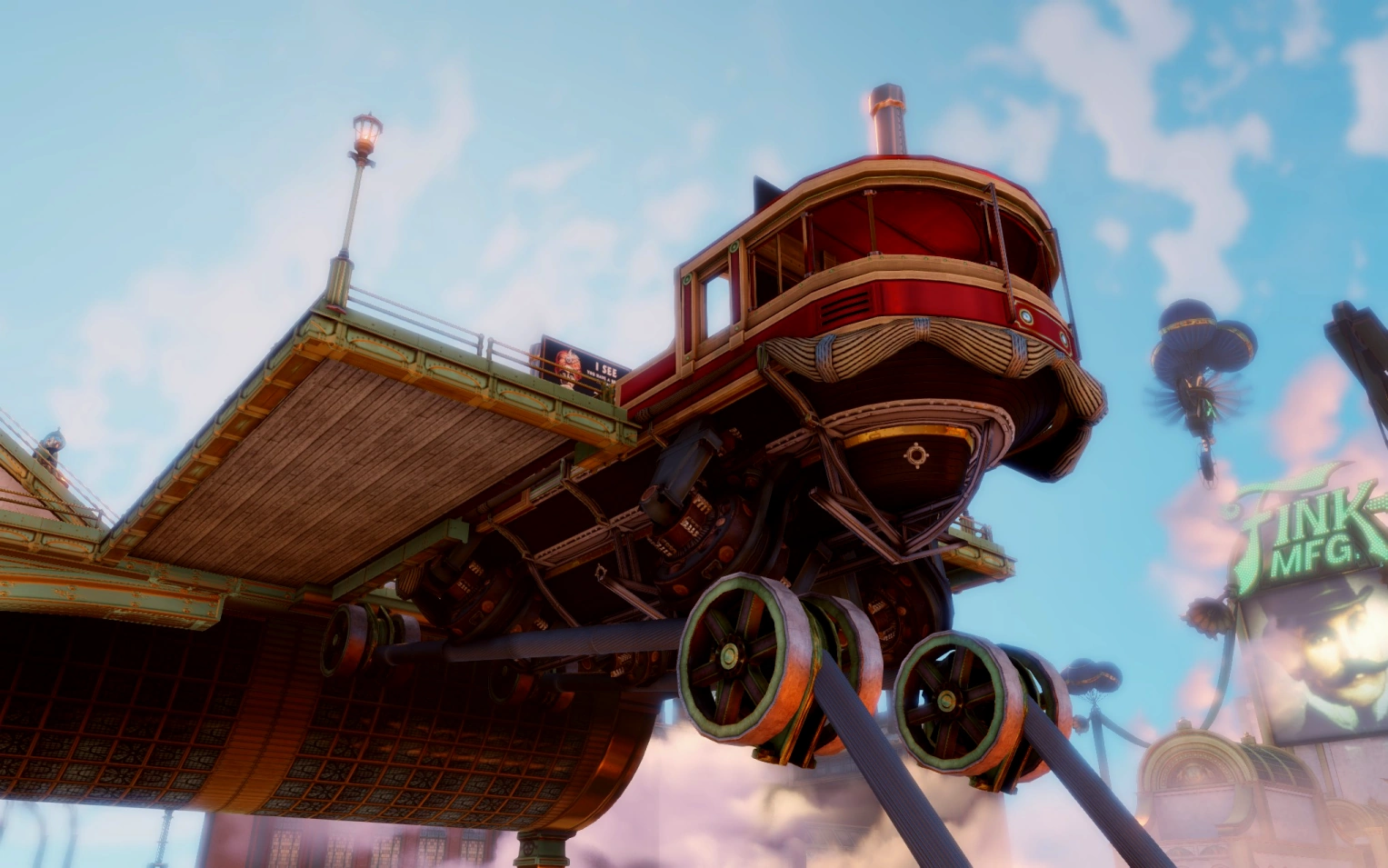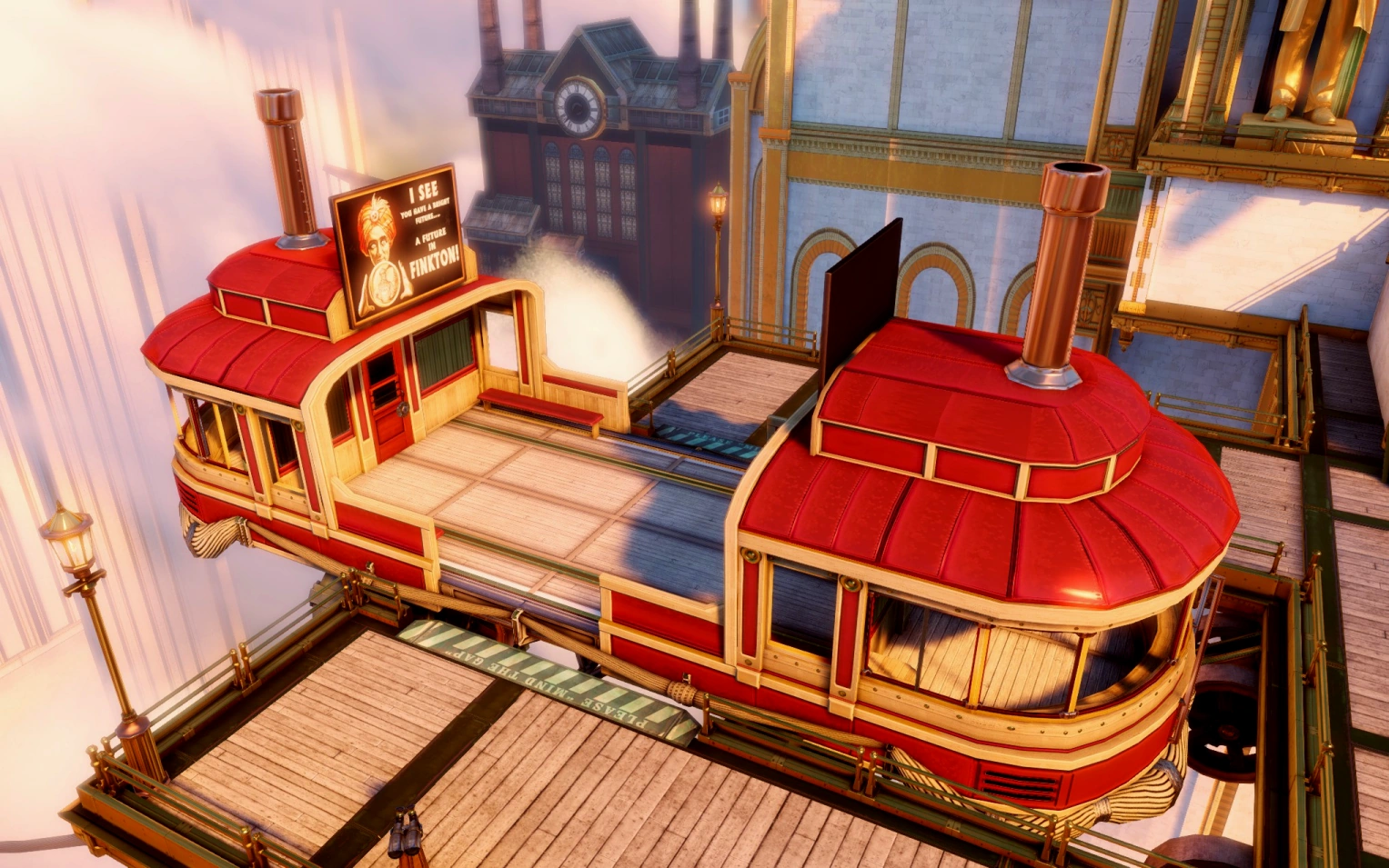 Gondolas are aircraft using a Lutece Particle system to float and whose main purpose is to transport civilians around the city of Columbia. Most gondolas move along heavy steel cables and are controlled by levers. When moving, the cables do not appear to actually support the craft for much of its journey and seem to act more as guides for it. This allows for a much simpler control system. Given their behavior, gondolas make use of Lutece Particle technology to provide locomotion and stability while moving. Some have control systems powered by Shock Jockey, but the craft themselves do not seem to be powered by it.