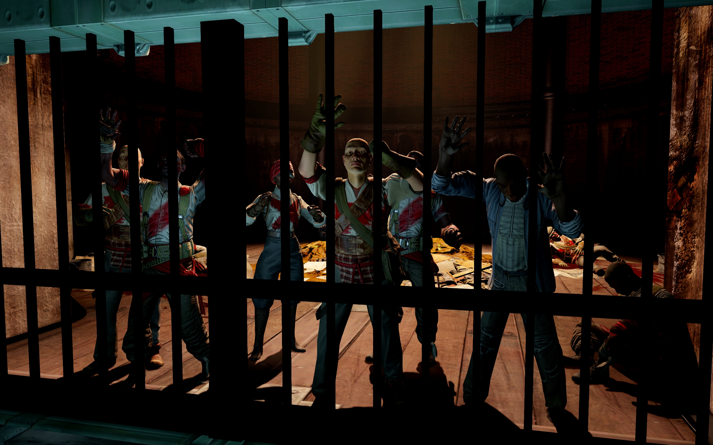 Elizabeth opens the Tear to a changed reality where the prison is filled with Vox agents and workers. Passing through the projection room, a running film reveals that while Lin was interrogated, he was suddenly ordered released by someone named Scofield. Two of the guards killed earlier are also alive, but they seem deeply disturbed and only partially there. As Booker and Elizabeth return to the main theater, they engage Fink's security force while Fink angrily questions Sansmark, his Head of Security, about how the duo got there. Elizabeth notices that the final man killed, Scofield Sansmark, was the body strung up on the clock in the previous reality. They leave the Good Time Club to go find Chen Lin at his Gunsmith Shop.