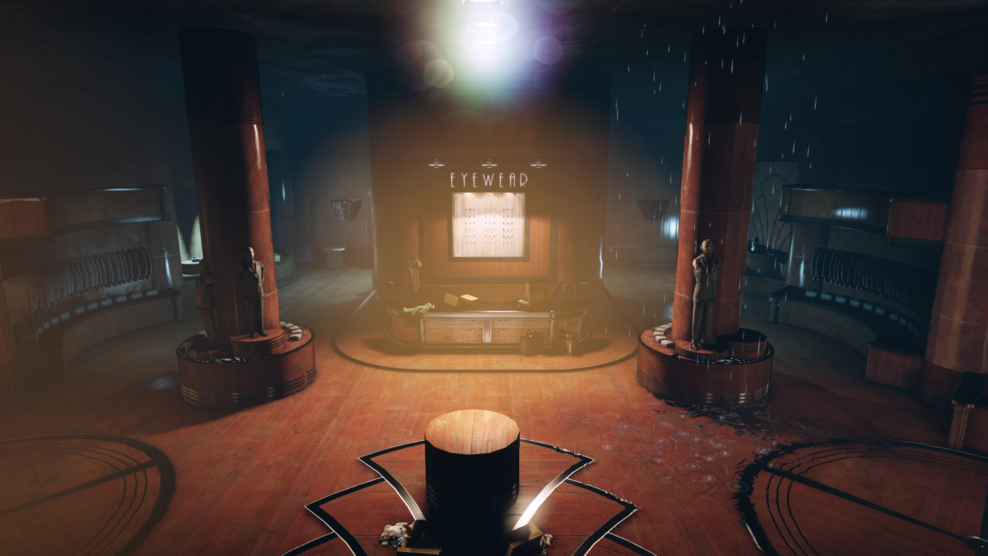 Eyewear is sold behind a counter, and further behind that are the changing rooms, guarded by a Turret. Two of the three changing rooms are accessible. One has a gear piece behind a felled table, along with some coins. An inmate probably stayed in the second room for some while, judging by the lantern, alcohol, coins, and cigarettes found here, along with the audio diary Critics.