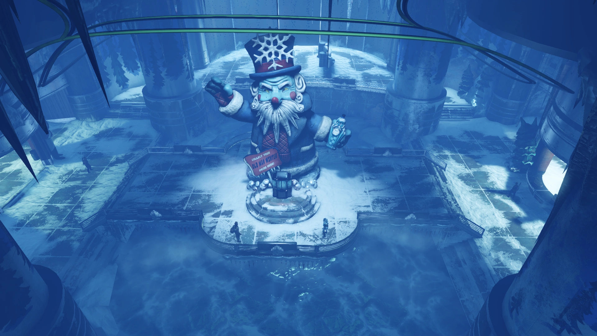 Back in the heyday of Fontaine's, Jack Frost's Village was the crown jewel of the Department Store building. The venue, a picturesque, polar fairytale land, recreated a little piece of the surface world the Rapture populace had left behind when they journeyed under the sea. More importantly to Frank Fontaine, the ice rink was a solid business he could capitalize off of. The place was a popular source of exercise and entertainment, so even customers who had no intention of shopping for clothes would journey to the Department Store just to buy a ticket. The site was also an ideal location to advertise the Drinkable Plasmid Old Man Winter.