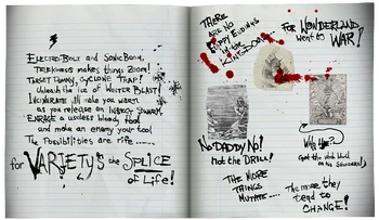 (Picture of the White Rabbit from Alice in Wonderland covered in blood splotches. Also, a picture of Atlas holding up a globe.)