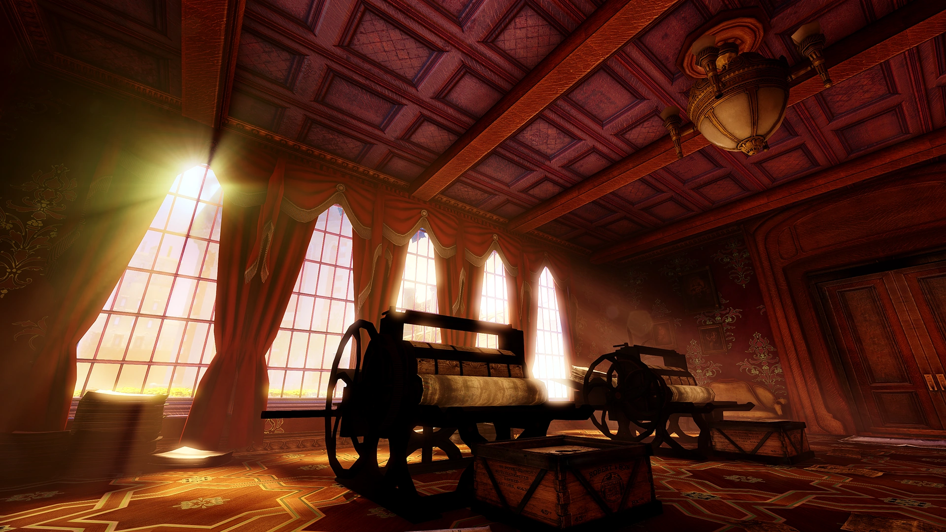 The apartment's study is in its normal state, probably as a facade for any Founder-allied visitors. A small reading area is set in front of the lit fireplace and a drawer with some Silver Eagles on it leans against the wall. The desk containing two posters for the cause as well as the usual utilities is overlooked by another Abraham Lincoln painting. A chair set by another exit holds a Machine Gun and a bottle of Devil's Kiss, as protection from potential intruders. From here, Booker may enter Constitution Square and continue his journey.