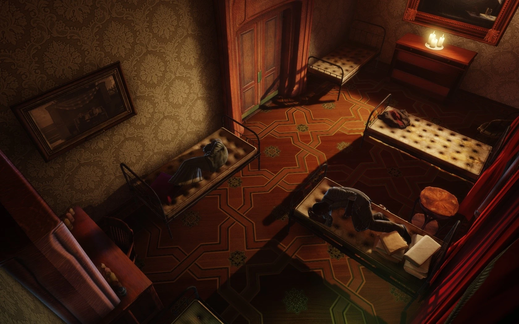 While the toilet is small and not a noteworthy location, except for containing a Medical Kit, the same can not be said for the bedroom. The bedroom has been converted into sleeping quarters for the less fortunate black citizens of the city. While the room is quite small, it still housed five beds, as well as a spare outside. Two citizens are resting as Booker walks in and another Medical Kit sits on the floor. A painting of Abraham Lincoln hangs on the wall.