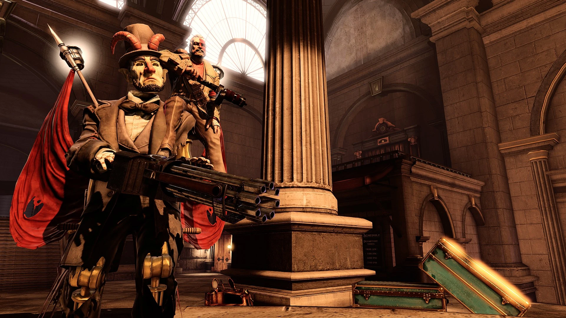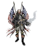 The Motorized Patriots were originally built to be tour guides for the city of Columbia,[1] representing the beliefs of the Founders. With the war between factions, they were reprogrammed by different factions to be destructive foes. Wearing flags, a presidential facade, and shouting propaganda, this clockwork enemy is unwavering and brutal. Ken Levine, co-founder of Irrational Games says, "Unlike most of the enemies, he's completely fearless. He doesn't have a sense of self-preservation, so he'll just keep coming at you and coming at you and coming at you."[2] As the player deals damage to the Motorized Patriot, the porcelain-like rubber mask will fall off, revealing the skeleton-like metal and wooden frame behind the mask.