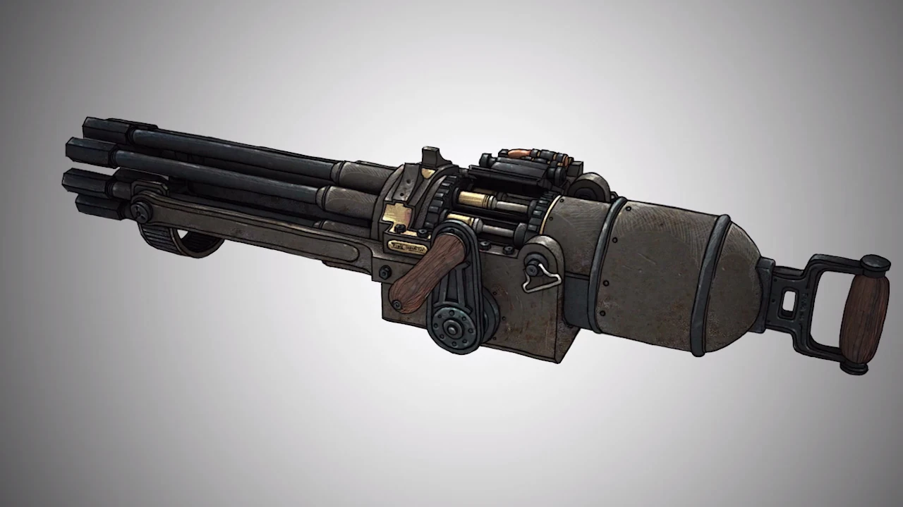 The Motorized Patriot features a new heavy weapon, the Peppermill Gatling Gun, known simply as the Crank Gun in-game. Unlike the Rivet Gun wielded by Rosie Big Daddies, the Peppermill is usable by the player character, Booker DeWitt. Outside of rare environment Tears, they can only be found on a Motorized Patriot. The weapon can carry 200 rounds, and has 100 bullets in each magazine. Extra ammunition for the Peppermill cannot be obtained, so once all the rounds are spent, the gun becomes useless to the player.