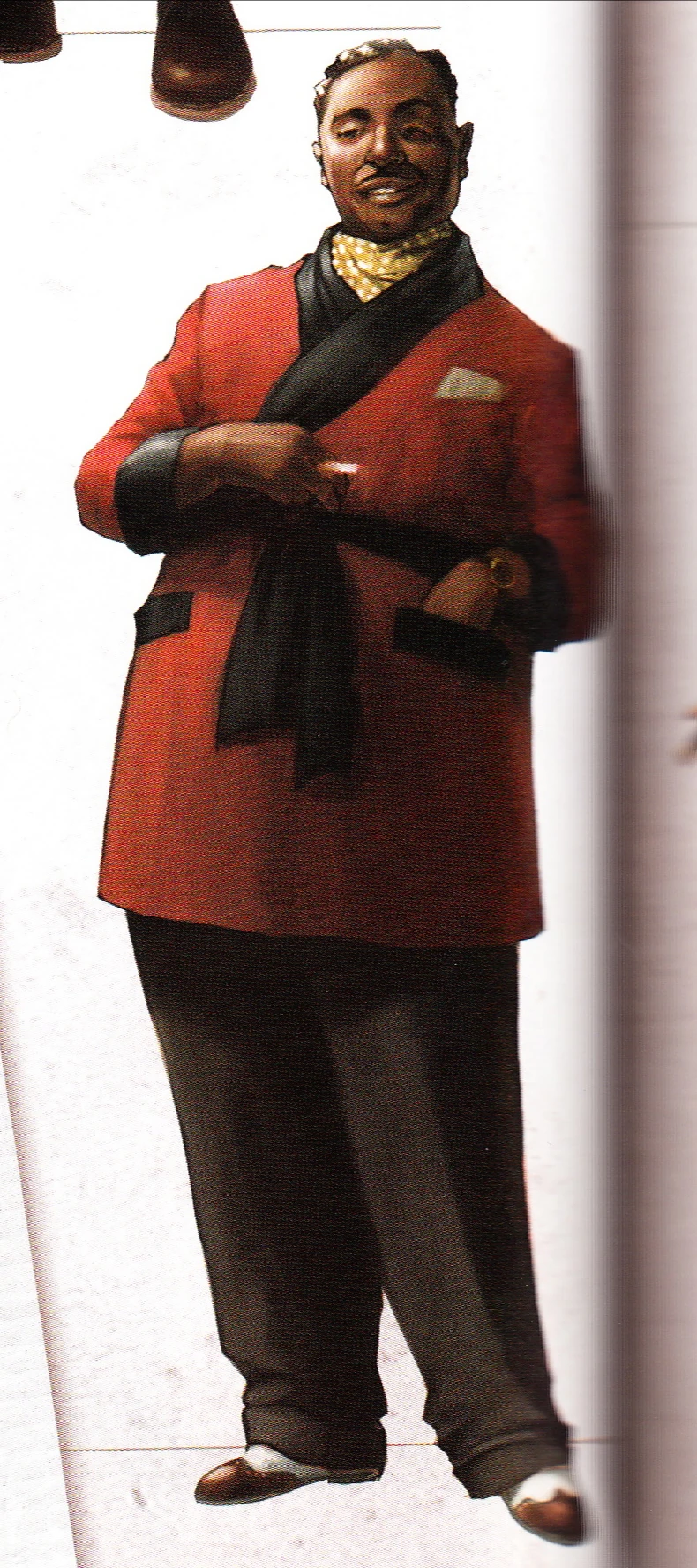 A once hard working man of style and flare, Oscar is dressed to impress. His ensemble, like his lifestyle, is a picture of comfort and luxury: he wears a red velveteen smoking jacket with black trim, over a mustard polka-dotted cravat. His trousers are a more casual dark beige. His shoes are white and brown wingtips and are polished to a shine. His hair is worn in the popular "conk" style of the period, short and neatly side parted, and he has a small, well-groomed mustache. He also wears a golden watch with a leather strap. Calraca takes part in the annual Cricket Championship, and his cricket bat from the competition can be used as his personal melee weapon.