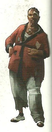 Sadly, there was no luxury in the war for Oscar. His robe has been left heavily torn at the front, with the breast pocket ripped off and the collar coming undone. His right pants leg is torn at the end and he has a thick bandage wrapped around his left knee. He has at some point lost his watch and cravat, exposing the wounds around his neck. His face is badly beaten with a thick cut on his forehead and across his nose. A bandage has been placed over his left eye and his right is discolored and sagging. His cuts continue down his chest, where cancerous lumps appear. Two more deep cuts rest on the back of his left hand.