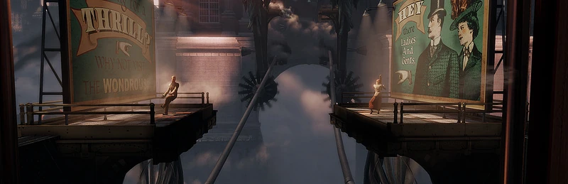 As the Gondola slowly climbs its way into the Grand Central Depot, Elizabeth suddenly recognizes the gentleman and lady who mysteriously appear on the platforms of the advertising billboards along the skyline. They are Rosalind and Robert Lutece. Rosalind was the scientist responsible for the technology that keeps Columbia afloat: "Quantum particles, suspended in space-time from a fixed height."