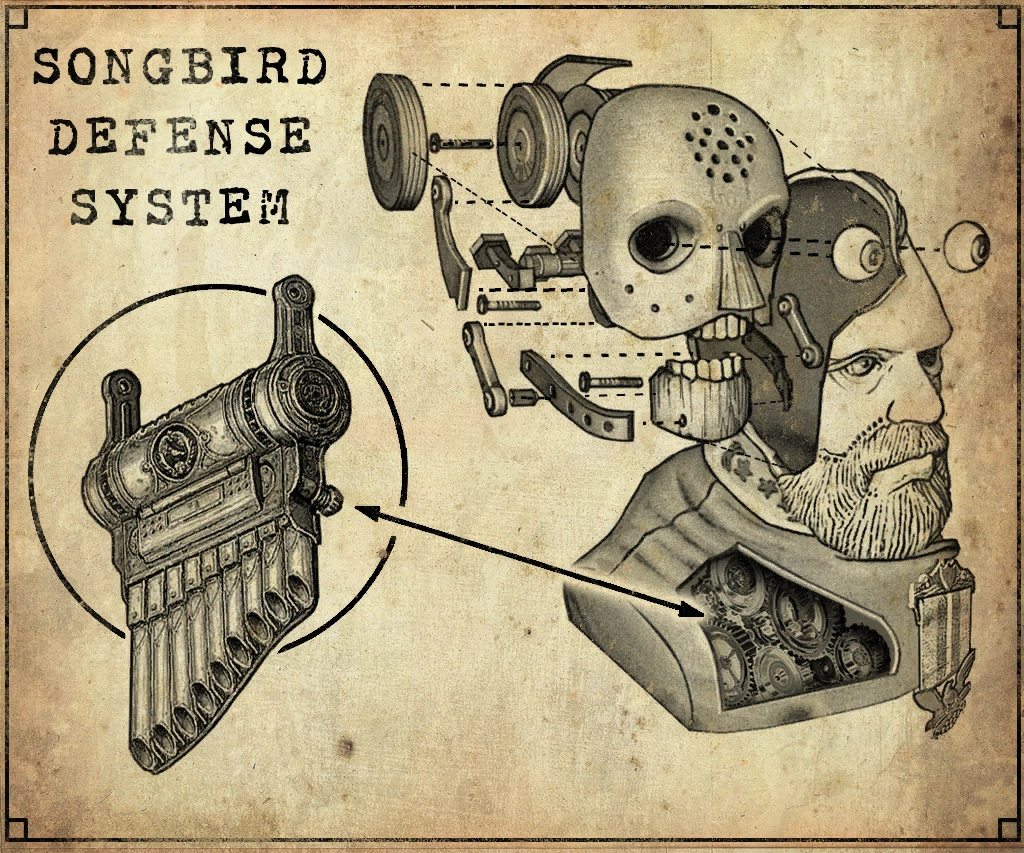 Satisfied that her experiment has paid off, the lady asks, "Would you care to hear anything else, brother? Perhaps a waltz?" The pianola jumps to life playing Schubert's "Valse Sentimentale No. 1" as she nonchalantly hums along. The gentleman then offers a card detailing the Songbird Defense System, which shows a diagram for the singing statues and its internal Whistler. Booker wonders aloud that if Comstock uses songs to control the Songbird, are there any others which render him more docile? The lady recommends they ask "the maestro himself."