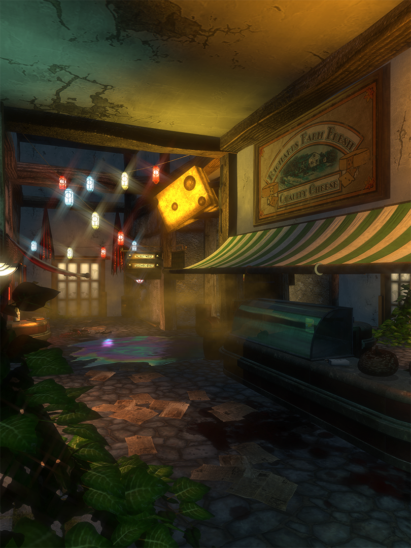 When Jack reaches the market in search of Lazarus Vector components, the business is a husk of its former self. A Security Camera overlooks the stand while a Baby Jane Thuggish Splicer searches beneath the counter for some useful loot, but there's not much to find. Even though it is a cheese store, rotten pumpkins can be found on top of the stand's counters along with a carton of bandages and a pack of cigarettes. A lockbox containing an Empty Hypo and some film can be found underneath.