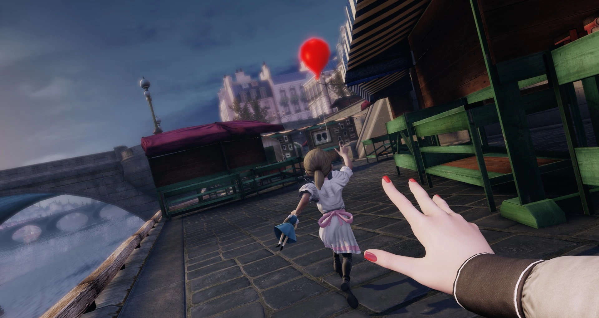 Elizabeth abandons Sally in the heated vent after the Big Daddy kills Comstock, but the enraged monster then turns against Elizabeth and kills her. Due to Elizabeth's unique condition, she doesn't die outside of Rapture and in the recesses of her mind, Elizabeth dreams of an over-romanticized Paris, which takes a turn when Sally appears in the city. As a confused Elizabeth approaches the non-Little Sister Sally, she loses the grip of a red balloon from her hand and runs after it, ignoring Elizabeth's pleas. After a chase through a now nightmarish Paris, ending at DeWitt Investigations, Elizabeth can no longer ignore her guilt and remorse for using Sally as bait and leaving her to die, after seeing her as a Little Sister screaming in the scalding hot vent. The haunting feelings become too strong and Elizabeth chooses to return to Rapture and save Sally, even if it means losing her quantum powers by returning to a universe where she has died. Eventually, Elizabeth awakens next to Comstock's body as Sally is taken hostage by Atlas and his henchmen. Facing execution by one of his thugs, Elizabeth lies that she is Suchong's lab assistant. She offers in exchange for Sally's freedom to get Atlas and his men out of their prison.