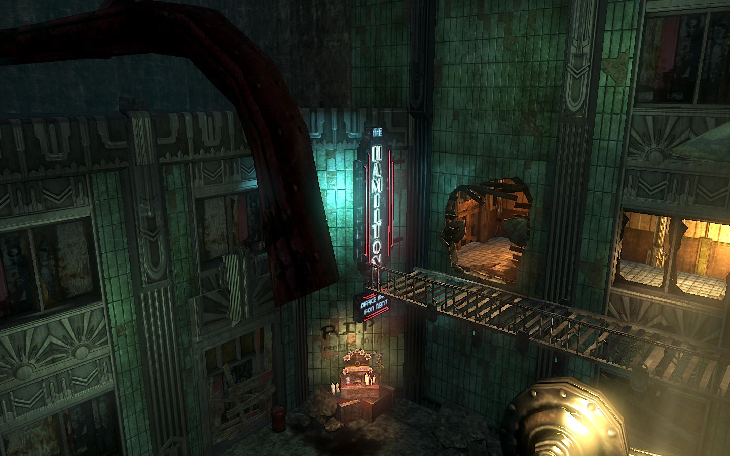 When Subject Delta arrives at The Hamilton, the normal means of egress on the first floor is blocked off. Entrance can be gained from a makeshift walkway on the second floor of the neighboring Fontaine Clinics.