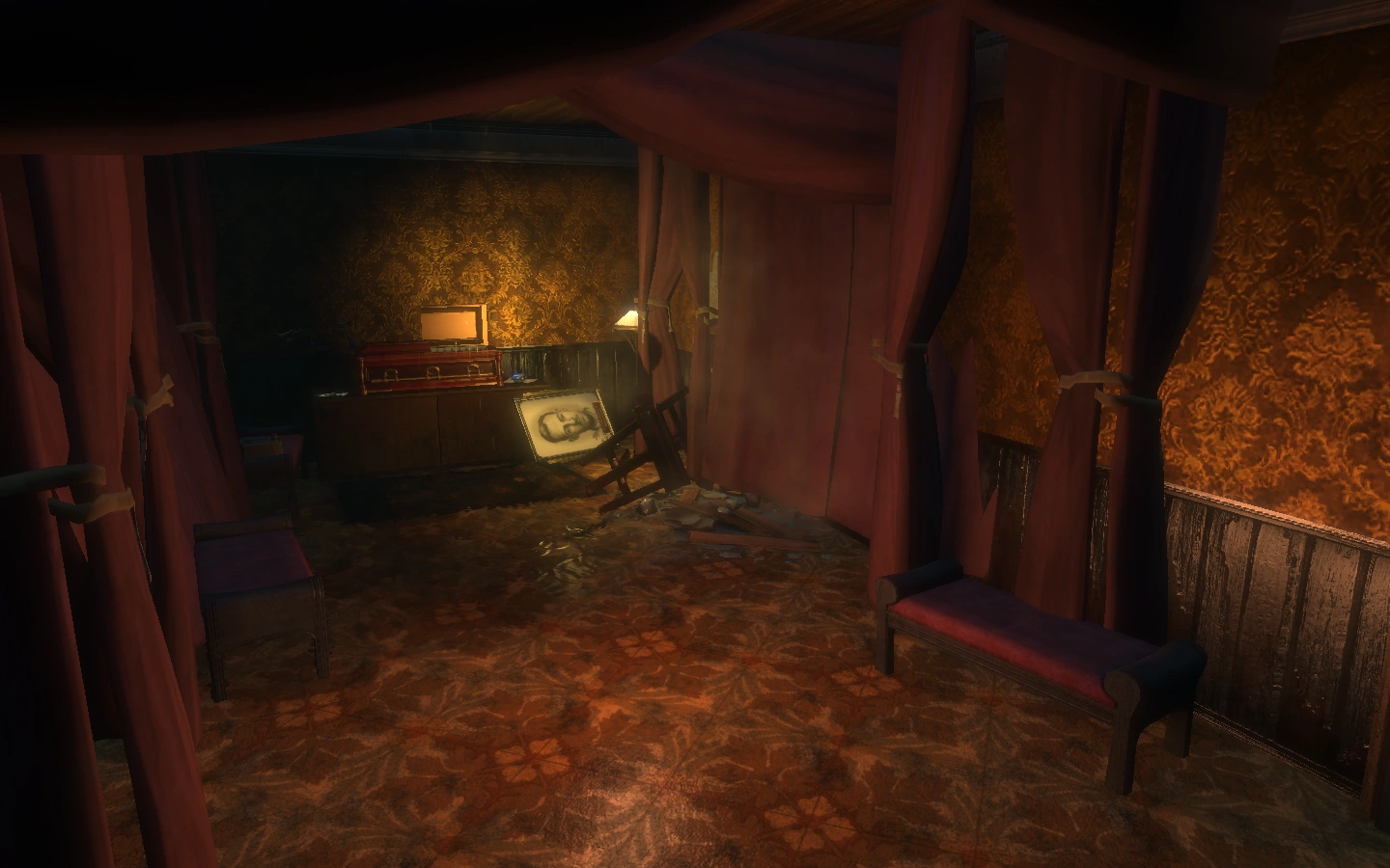 The reception desk in Twilight Fields is by far the most welcoming in the Medical Pavilion. Comfortable couches, fancy curtains, and a warm light are a window to the past luxuries of Rapture. Only small amounts of damage are evident from the Civil War. As is demonstrated from the menu above the desk, Twilight Fields offered a wide variety of caskets and services. The cash register and body lying under the desk show signs of looting. Organ music can be heard playing from the reception area.