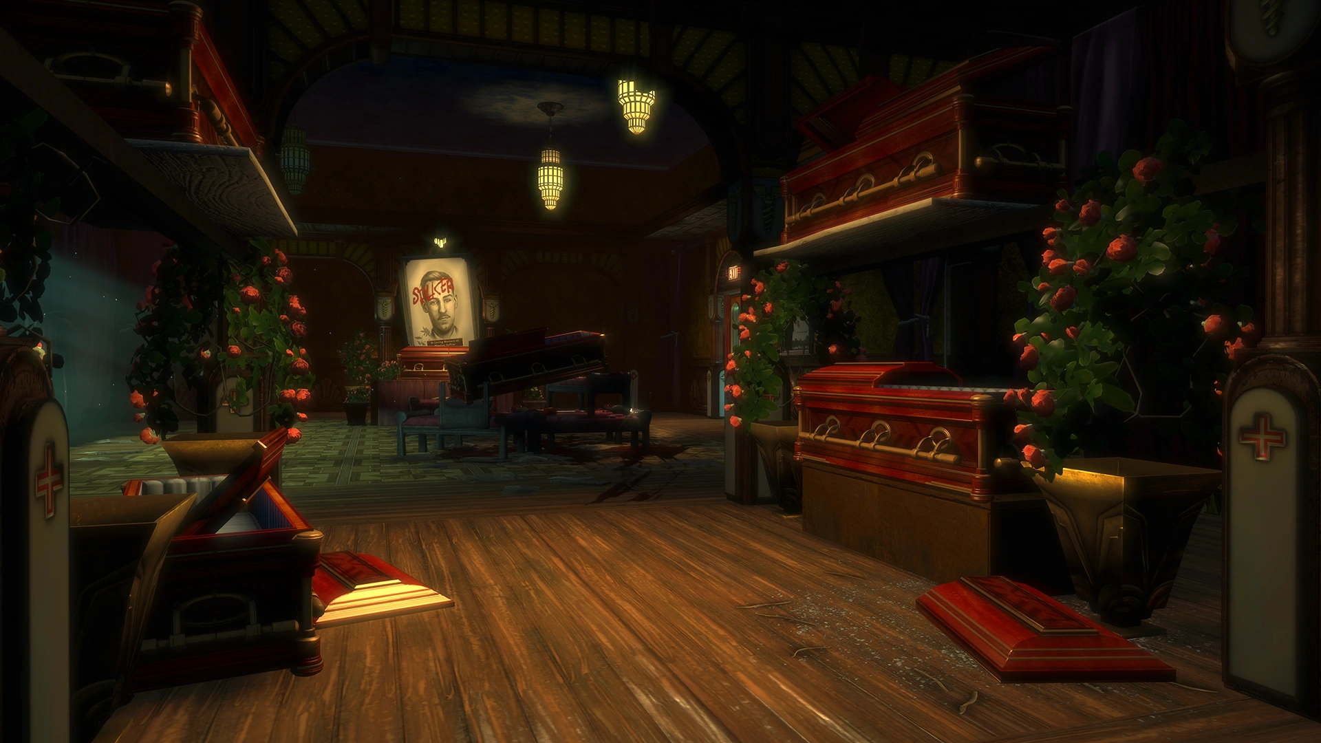 The second room of Twilight Fields contains a pile of bloody benches topped by an empty casket. It also contains a memorial for Winston Hoffner, with his large portrait with "SPLICER" written on it, hung over a closed casket. This room also holds an EVE Hypo and ammunition pack. This part of the funeral home can be accessed through a door in the western hallway or through a grated vent from an alcove of leaky pipes to the north.