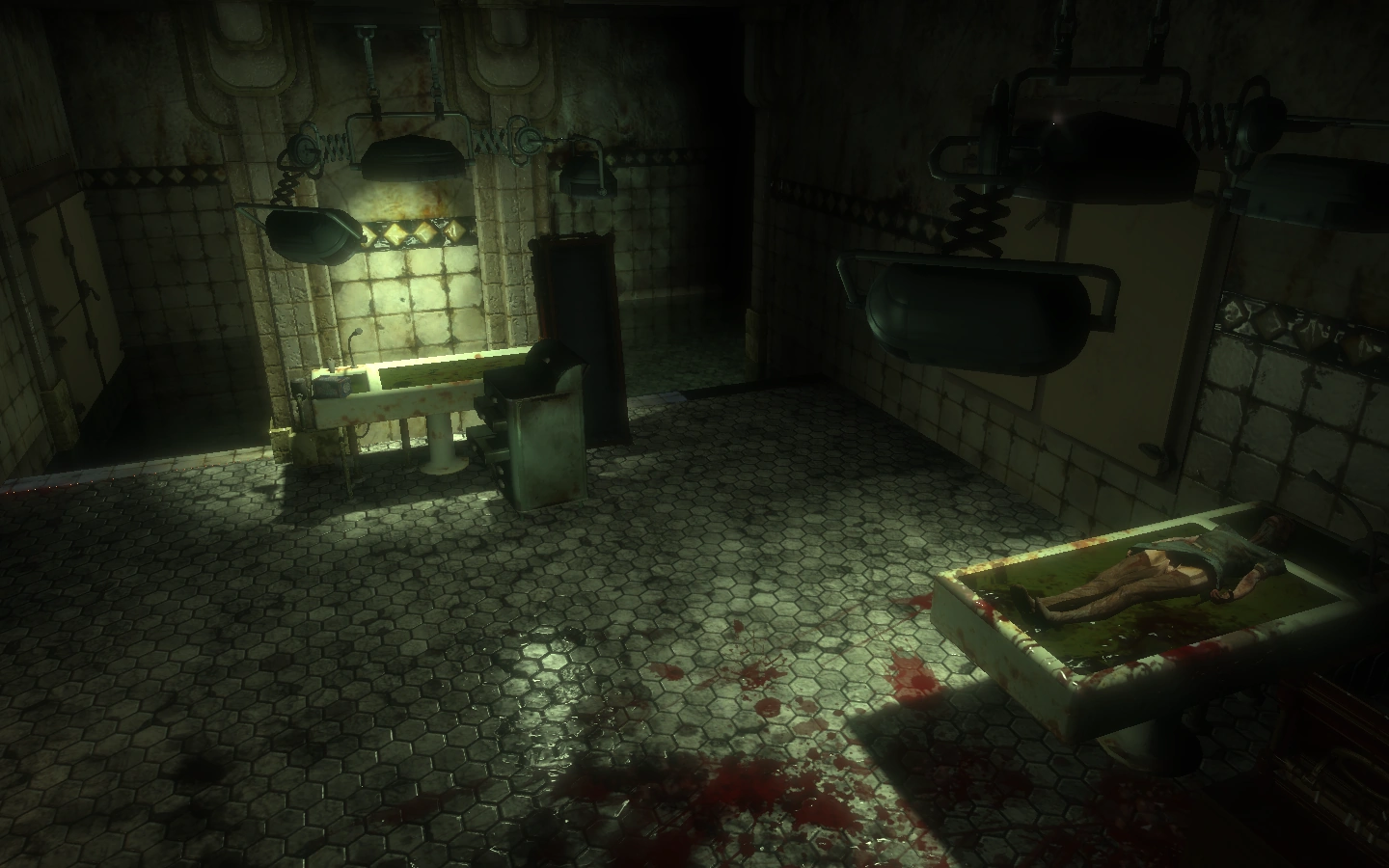 Directly behind the reception desk is the sliding door to the preparation room. Flooding is evident in the adjacent hallway. This room is used to dress up the body for viewing. Several washing tables can be seen from the entrance. The medical cabinets and locked storage units are empty and unimportant. A single carton of Bandages can be found on the table to the left. As Jack approaches the flooded corridor, the body of a Dr. Grossman Splicer eerily drifts by. At the end of the hall, the shadow of a figure can be seen on the wall. When the shadow is approached, the lights flicker off, and a short time later, flicker on to reveal that the shadow has disappeared. One of the storage units can be seen closing as Jack rounds the corner. The Gene Tonic, Security Expert, as well as three Pistol Rounds, are found on a medical cabinet. If Jack searches the corpse on the washing table, he will find four dollars. After wading back through the hall, Jack will encounter the Dr. Grossman Splicer, who was casting the shadow earlier, hiding in one of the storage units. Looting his body yields two Armor-Piercing Pistol Rounds.