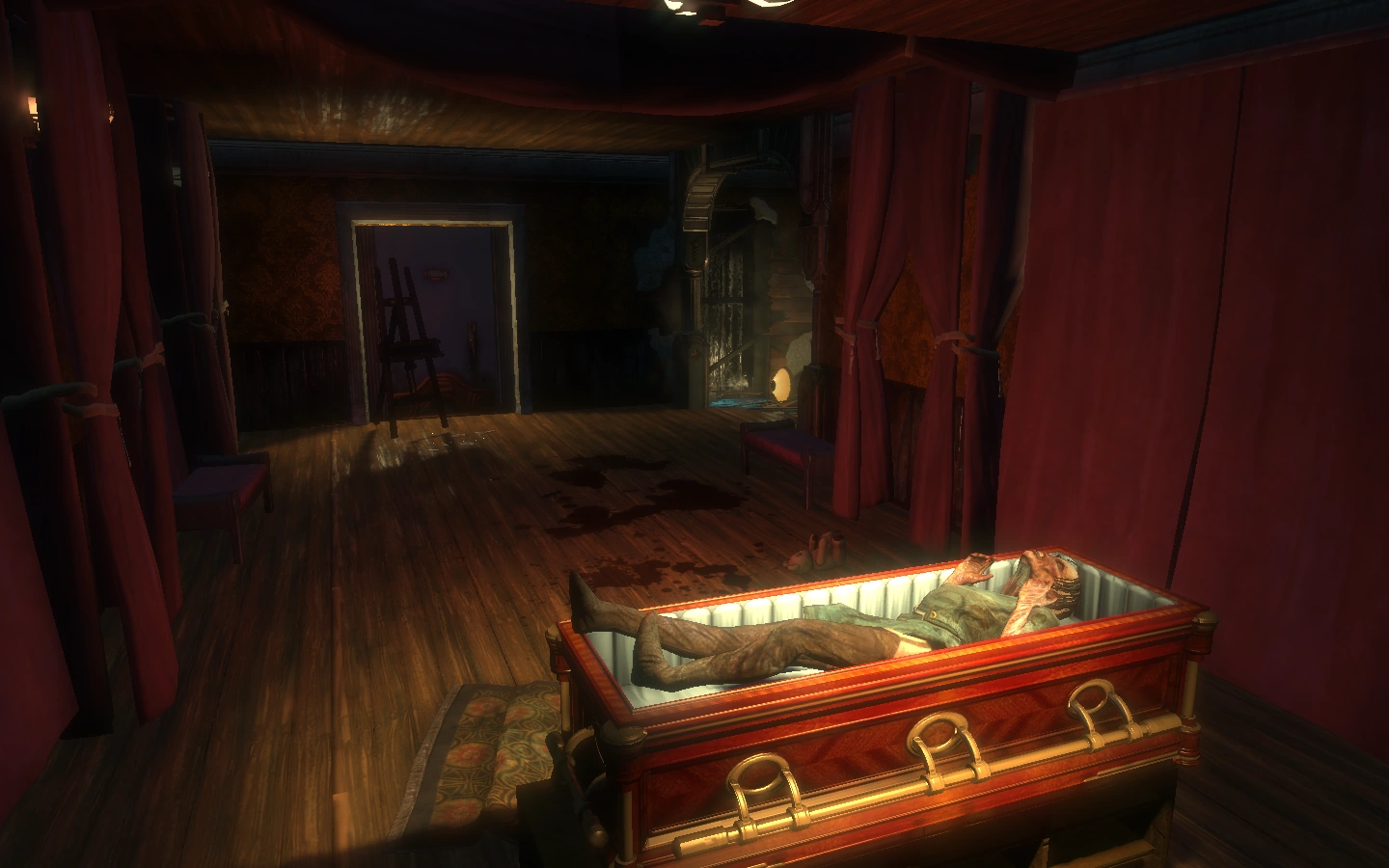 To the left and right of the reception desk are two viewing rooms for deceased loved ones. The eastern room contains a locked closet as well as a corpse ready for viewing. As Jack enters the room, a Thuggish Splicer throws the casket off its stand, spilling the corpse, and races towards him. Searching the corpse yields ten Dollars. Over behind the casket stand, Jack finds two bottles of Old Tom Whiskey, four Armor-Piercing Pistol Rounds, and eleven dollars. Upon taking the Anti-Armor Rounds, the locked closet slides open to reveal a Turret hacked by the Thuggish Splicer. Behind the Turret is a safe containing seventeen dollars, ten 00 Buck, and three Armor-Piercing Pistol Rounds.