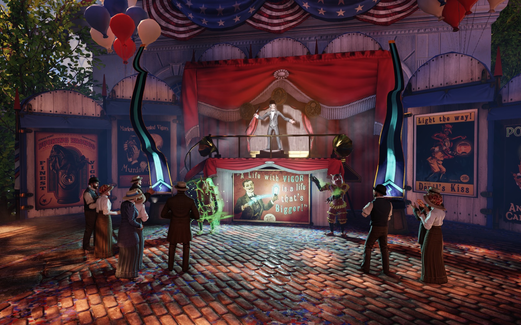 Upon arriving at the Fairgrounds two men in devil costumes demonstrating different Vigors. Specifically, Shock Jockey, Devil's Kiss, Bucking Bronco, and Possession. The Vigors being demonstrated are clearly less powerful that those used later in the game by Booker. An example of this is Bucking Bronco. In the demonstration and at the Cast Out the Devil game, the person who is targeted is almost gently lifted in the air, while the one Booker uses later on violently wrenches the target off the ground. The weaker versions of the Vigors are not supposed to be weapons, but are intended to be useful to the user. Shock Jockey just needs to be able to power machines, Devil's Kiss create small fires and was advertised being use to create light, Bucking Bronco was for helping to lift and Possession forces machines to refund money.
