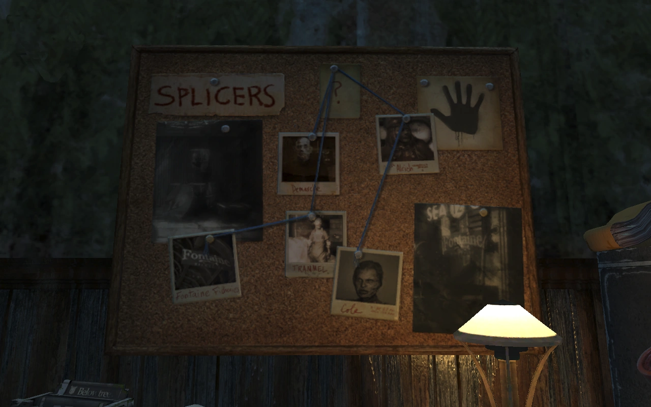 Through the one-way mirror, Jack can see the corpse of an interrogator and the Spider Splicer who killed him. After Jack takes a few pictures, the Splicer leaps through a hole in the ceiling.