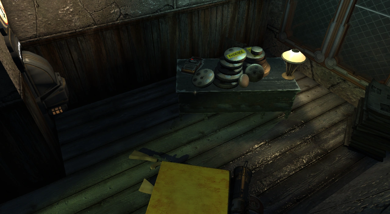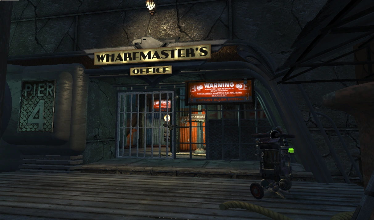 Jack journeys to the Upper Wharf, finding a RPG Turret beside the locked entrance to the Wharfmaster's Office. Up the stairs are a pair of Security Cameras and some Frag Grenades hidden behind some crates near the second Camera. The Wharfmaster's Office is under high security; there are two RPG and two Machine Gun Turrets, as well as Security Cameras that keeps watch over the hall, Office, and jail cells. Even with these extreme security measures, it is clear upon entering that the Wharfmaster's Office was the site of an extreme firefight, which caused severe structural damage beyond that of the normal deterioration in Rapture.